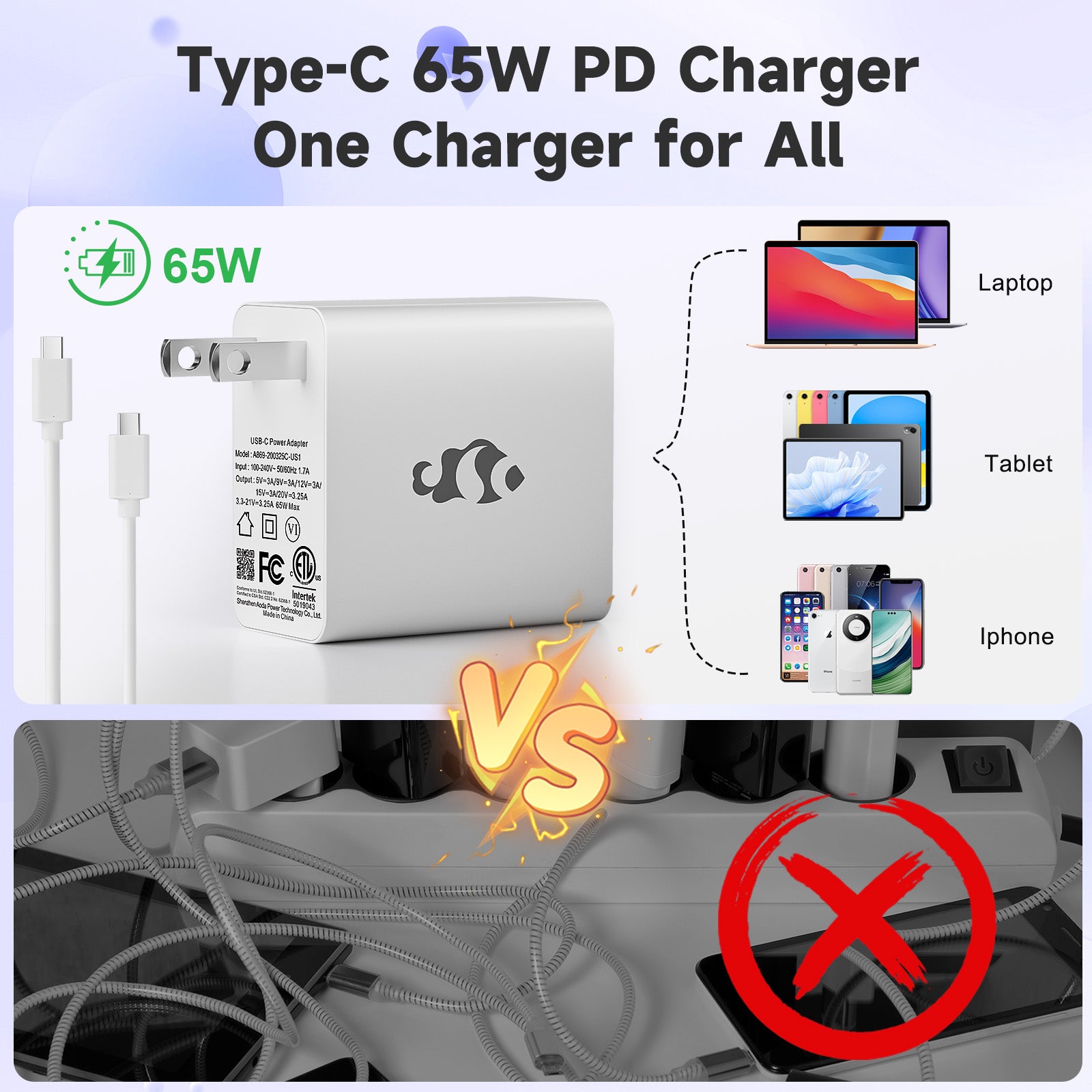 • 【65W Type-C PD charger】One charger for all Type-C devices, providing fast, portable power without the bulk of traditional chargers.
