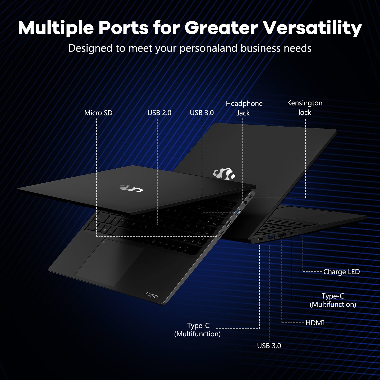 The Nimo N153 is engineered for the student lifestyle. Weighing only 4.4 pounds and boasting a slim 0.76-inch profile, it's effortlessly portable. Choose from sophisticated silver, vibrant ocean blue, or elegant rose gold to match your individual taste and stay productive on the move.