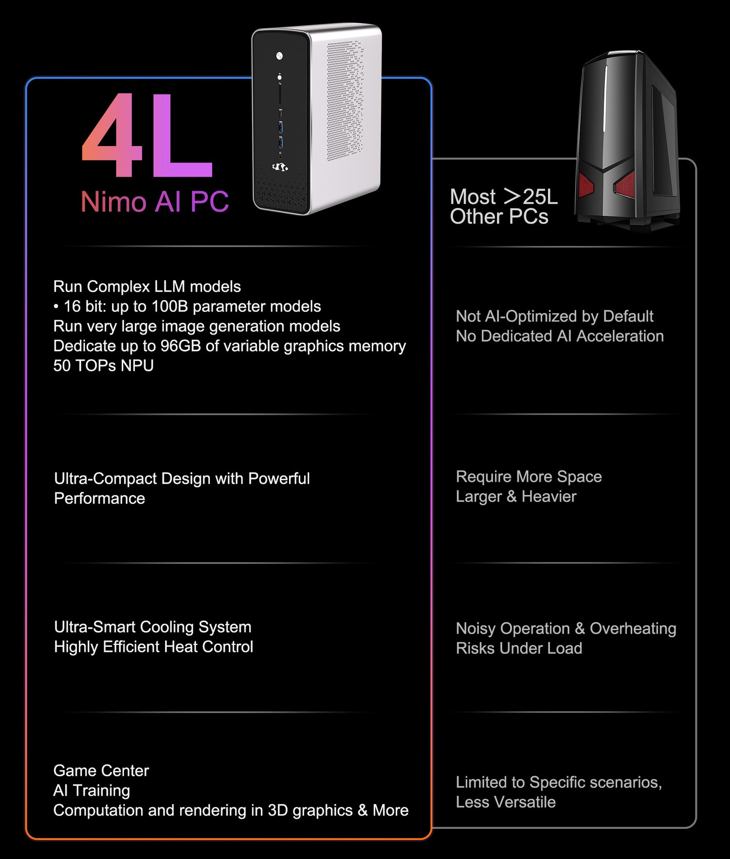 The Nimo AI PC packs cutting-edge AI performance into an ultra-compact 4L body, purpose-built for today’s most demanding workloads. From running 100B parameter LLMs to generating ultra-high-resolution images, it delivers exceptional AI acceleration with up to 96GB of variable graphics memory and a 50 TOPs NPU. While most traditional desktops are over 25L in size, heavier, and not optimized for AI tasks, the Nimo AI PC is lighter, faster, and quieter, thanks to its smart thermal design and highly efficient heat management. Whether you're training AI models, rendering 3D graphics, or building your next game, Nimo offers unmatched versatility and performance in a fraction of the space.