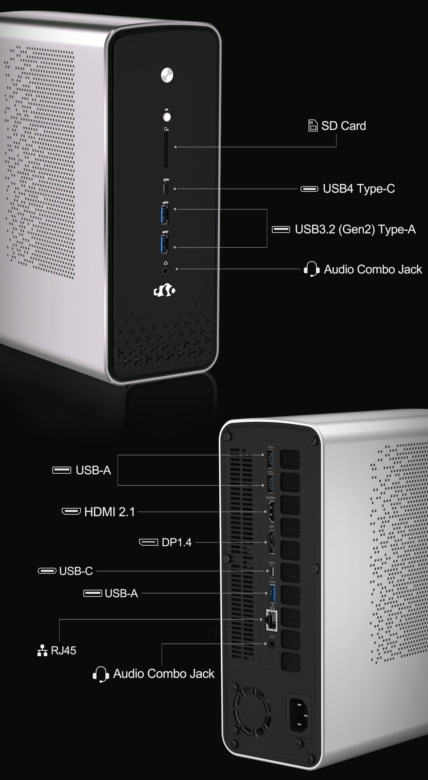 Say goodbye to bulky docking stations.The NIMO AI Mini PC comes equipped with 13 high-performance ports, including USB 4, HDMI, DisplayPort, 2.5G Ethernet, and more—ready to power multiple displays, ultra-fast data transfers, and all your essential peripherals. Whether you're building AI models, gaming, or working across devices, every connection you need is built right in.