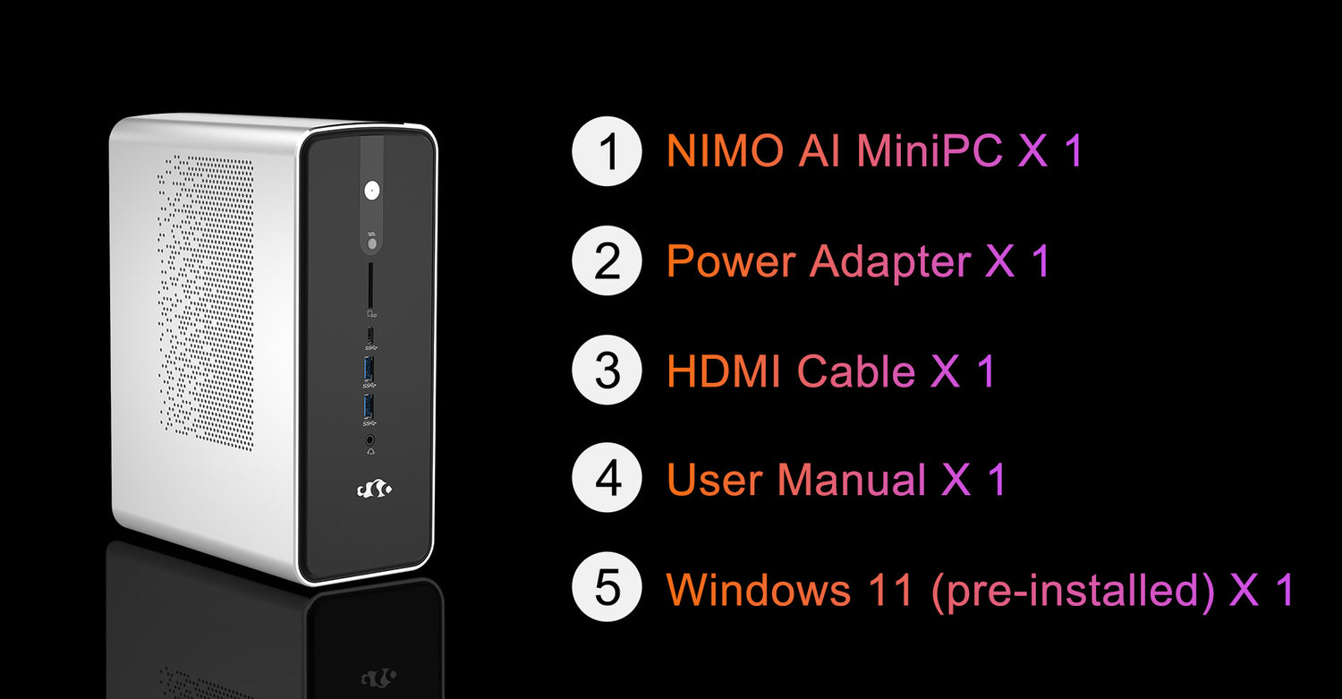 The Nimo AI PC packs cutting-edge AI performance into an ultra-compact 4L body, purpose-built for today’s most demanding workloads. From running 100B parameter LLMs to generating ultra-high-resolution images, it delivers exceptional AI acceleration with up to 96GB of variable graphics memory and a 50 TOPs NPU. While most traditional desktops are over 25L in size, heavier, and not optimized for AI tasks, the Nimo AI PC is lighter, faster, and quieter, thanks to its smart thermal design and highly efficient heat management. Whether you're training AI models, rendering 3D graphics, or building your next game, Nimo offers unmatched versatility and performance in a fraction of the space.